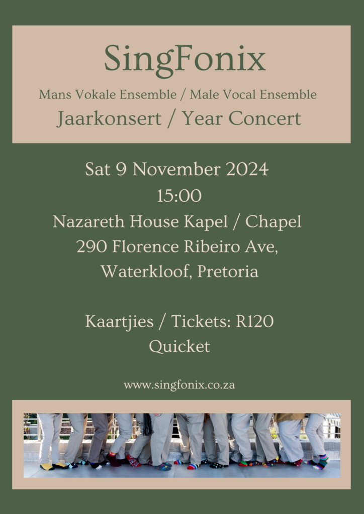 Despite being based in Pretoria, SingFonix gladly travels to other cities and towns. No formal fee is charged for performances (any contributions to cover their costs and to enable them to continue servicing the community will be welcomed).